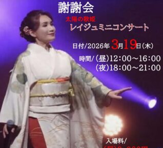 陽気な歌姫 ~旧正月レイジュミニコンサート~ 日付 2026年2月14日(土) 時間 昼 12:00~16:00 夜 18:00~21:00 入場料 昼 2,000円(税込) 夜 2,500円(税込)…