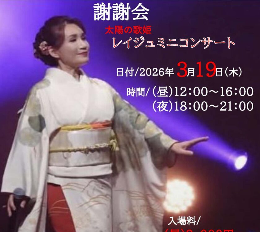 陽気な歌姫 ~旧正月レイジュミニコンサート~ 日付 2026年2月14日(土) 時間 昼 12:00~16:00 夜 18:00~21:00 入場料 昼 2,000円(税込) 夜 2,500円(税込)…