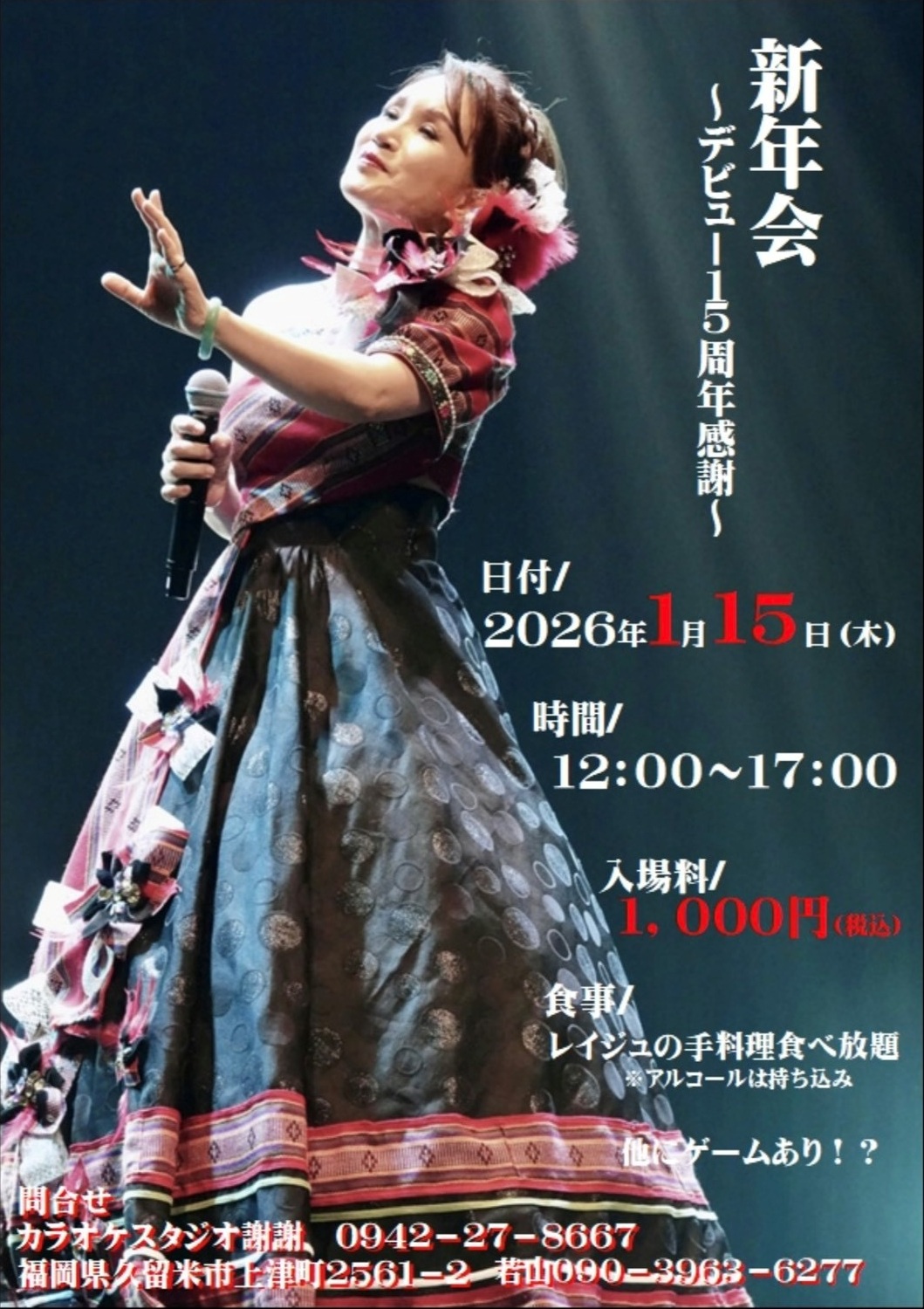 新年会 ~デビュー15周年感謝~ 2026年1月5日 by rayju 日付2026年1月15日(木)時間12:00~17:00入場料1,000円(税込)食事レイジュの手料理食べ放題 ※アルコールは持ち込み他にゲームあり!?会場カラオケスタジオ謝謝福岡県久留米市上津町2561-2 TEL:0942-27-8667問い合わせカラオケスタジオ謝謝(0942-27-8667) 若山(090-3963-6277) Topics