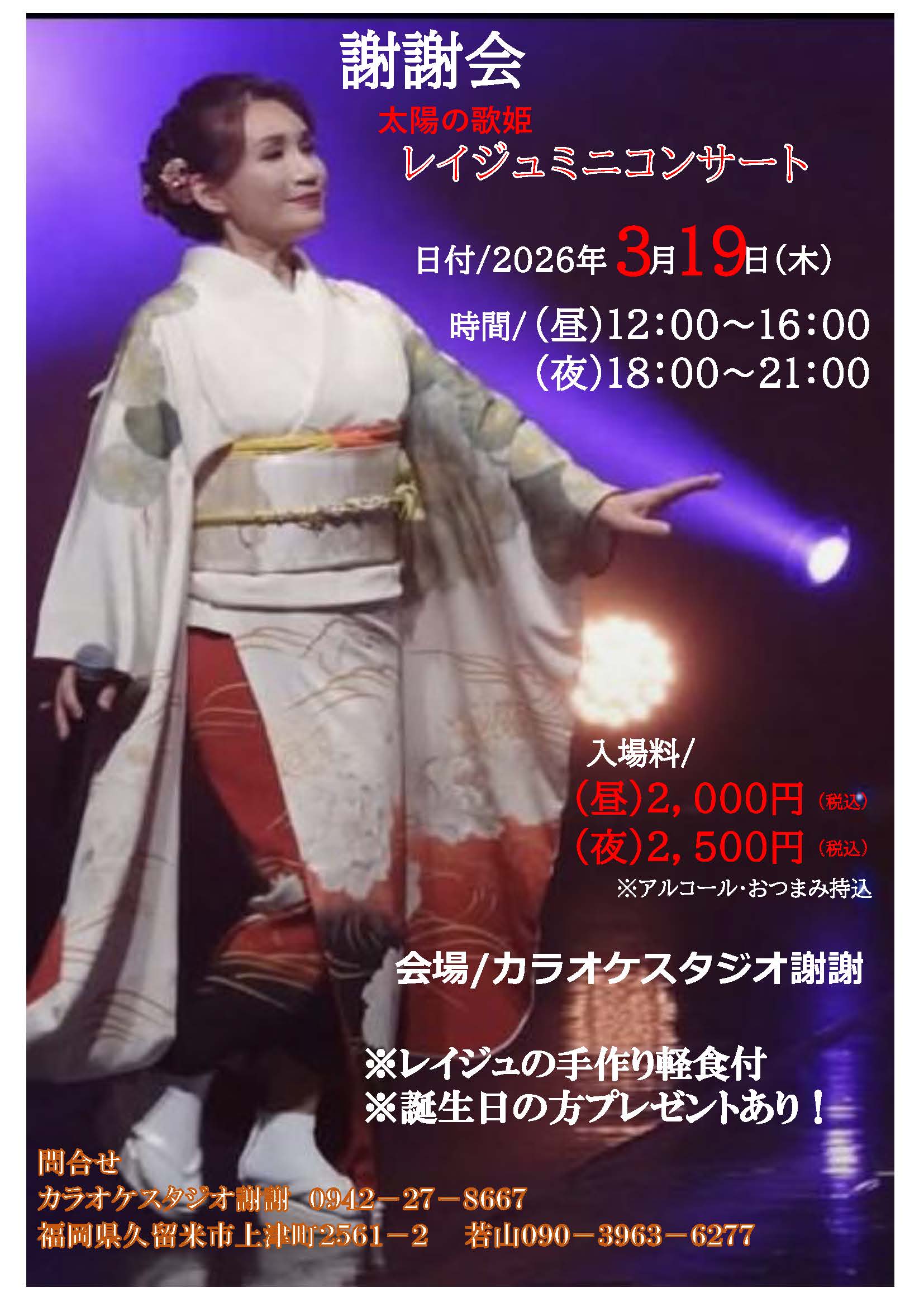 3月謝謝会 2026年2月26日 by rayju 日付2026年3月19日(木)時間昼 12:00~16:00 夜 18:00~21:00入場料昼 2,000円(税込) 夜 2,500円(税込)※アルコール・おつまみ持込食事レイジュの手作り軽食付 誕生日の方プレゼントあり!会場カラオケスタジオ謝謝福岡県久留米市上津町2561-2 TEL:0942-27-8667問い合わせ株式会社S・K・Kプロダクション(若山) TEL:090‐3963‐6277 Topics